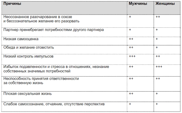 - обоюдная вина по разным причинам (алкоголь, скука, ссора, малое общение, минутная слабость);