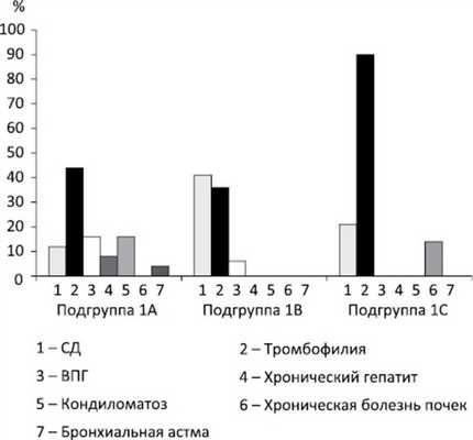 В этой подгруппе (см. рис. 1) среди экстрагенитальной патологии выявлены СД в 11 (42,3%) наблюдениях, обострение ВПГ-инфекции — у 1 (3,8%) пациентки.