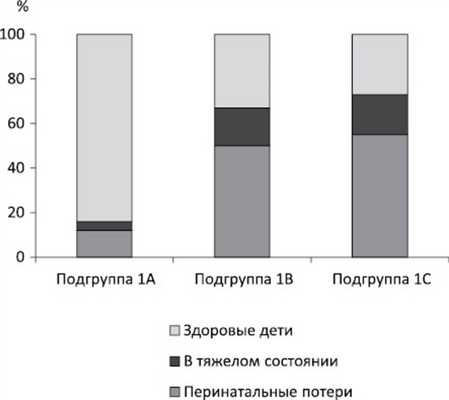 У 6 пациенток в группе 1В беременность была повторной. Все имели осложнения предыдущей беременности: отслойку плаценты и экстренное кесарево сечение (2), преждевременные оперативные роды в 36 нед по поводу тяжелой преэклампсии (1), антенатальную гибель плода (1), невынашивание беременности (2), т.е. в половине наблюдений в этой подгруппе предыдущая беременность закончилась фатальными осложнениями. Во время данной беременности у 1 пациентки произошла отслойка плаценты, у 1 выявлен СЗРП III степени, и в 2 наблюдениях обнаружены критические показатели плодового кровотока в начале III триместра, что потребовало экстренного досрочного родоразрешения.