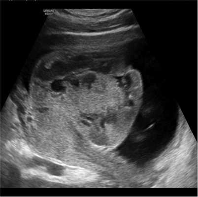 Неполный пузырный занос — частичное перерождение плаценты, при котором эмбрион продолжает развиваться, всегда триплоидный, с 1 материнской хромосомой (чаще — 69ХХУ, 69ХХХ, реже — 69ХУУ), имеются фрагменты нормальной плаценты и плода [27]. Эхографические критерии полного пузырного заноса: увеличение размеров матки, несоответствие сроку беременности, эмбриона и его частей в полости матки нет, содержимое полости — бесформенные гиперэхогенные структуры с множеством кистозных образований, граница опухоли и миометрия отчетливая, ровная, возможна визуализация расширенных сосудов миометрия.