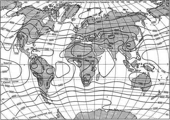 ческих широт к полюсам в соответствии с уменьшением угла падения солнечных лучей (рис. 23). Отклонения от зонального распределения объясняются различной облачностью и прозрачностью атмосферы. Наибольшие годовые величины суммарной радиации 7200 — 7500 МДж/м 2 в год (около 200 ккал/см 2 в год) приходятся на тропические широты, где малая облачность и небольшая влажность воздуха. Во внутриконтинентальных тропических пустынях (Сахара, Аравия), где обилие прямой радиации и почти нет облаков, суммарная солнечная радиация достигает даже более 8000 МДж/м 2 в год (до 220 ккал/см 2 в год). Вблизи экватора величины суммарной радиации снижаются до 5600 — 6500 МДж/м в год (140—160 ккал/см 2 в год) из-за значительной облачности, большой влажности и меньшей прозрачности воздуха. В умеренных широтах суммарная радиация составляет 5000 — 3500 МДж/м 2 в год (≈ 120 — 80 ккал/см 2 в год), в приполярных — 2500 МДж/м в год (≈60 ккал/см 2 в год). Причем в Антарктиде она в 1,5—2 раза больше, чем в Арктике, прежде всего из-за большей абсолютной высоты материка (более 3 км) и потому малой плотности воздуха, его сухости и прозрачности, а также малооблачной погоды. Зональность суммарной радиации лучше выражена над океанами, чем над континентами.