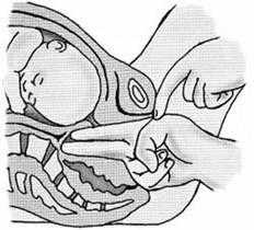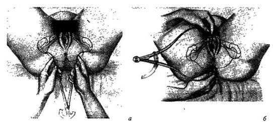 Диагональной конъюгатой (conjugata diagonalis) называется расстояние от нижнего края симфиза до наиболее выдающейся точки мыса крестца. Диагональную конъюгату определяют при влагалищном исследовании женщины, которое производят с соблюдением всех правил асептики и антисептики. II и III пальцы вводят во влагалище, IV и V сгибают, тыл их упирается в промежность. Введенные во влагалище пальцы фиксируют на верхушке мыса, а ребром ладони упираются в нижний край симфиза (рис. 4.13, а,б). После этого II пальцем другой руки отмечают место соприкосновения исследующей руки с нижним краем симфиза. Не отнимая II пальца от намеченной точки, руку, находящуюся во влагалище, извлекают, и ассистент измеряет тазомером или сантиметровой лентой расстояние от верхушки III пальца до точки, соприкасающейся с нижним краем симфиза.