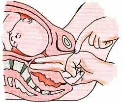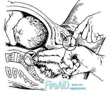 Диагональная конъюгата - это расстояние между нижним краем симфиза и выдающейся точкой мыса. Легкая доступность мыса свидетельствует об уменьшении истинной конъюгаты. Если средний палец достигает мыс, то прижимают радиальный край II пальца к нижней поверхности симфиза, ощущая край дугообразной связки лобка. После этого указательным пальцем левой руки отмечают место соприкосновения правой руки с нижним краем симфиза. При нормально развитом тазе величина диагональной конъюгаты равна 13 см. В этих случаях мыс недостижим.