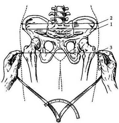 Рис. 7. Измерение поперечных размеров таза (1 - distantia spinarum, 2 - distantia cristarum, 3 - distantia trochanterica).