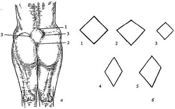 Рис. 12. Ромб Михаэлиса (а — общий вид: 1 — углубление между остистыми отростками последнего поясничного и первого крестцового позвонков; 2 — верхушка крестца; 3 — задневерхние ости подвздошных костей; 6 — формы ромба Михаэлиса при нормальном тазе и различных аномалиях костного таза (схема): 1 — нормальный таз; 2 — плоский таз; 3 — общеравномерносуженный таз; 4 — поперечносуженный таз; 5 — кососуженный таз).
