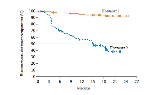 Рисунок 1. Пример кривых Каплана-Мейера по выживаемости без прогрессирования пациентов в одном из исследований. Красной линией обозначена 1-летняя выживаемость без прогрессирования, зеленой - медиана выживаемости без прогрессирования. Из графика видно, что препарат 1 демонстрирует значительные преимущества перед препаратом 2.