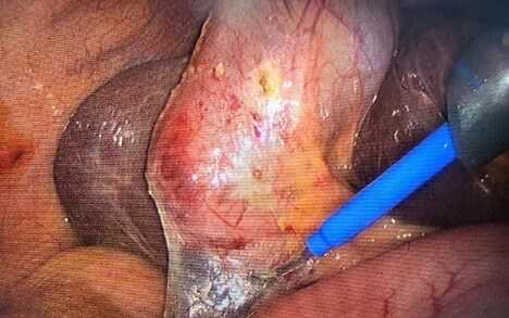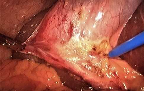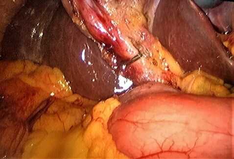 На этом снимке, при помощи лапароскопического инструмента вскрыта брюшина в области шейки жёлчного пузыря и выполняется мобилизация пузырного протока.