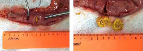 На фотографиях в просвете резецированного участка тонкой кишки находится конкремент, вызвавший кишечную непроходимость.
