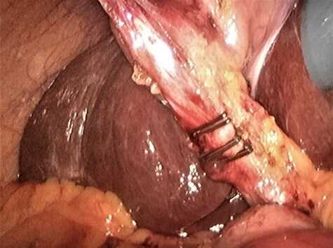 На этом снимке выделен пузырный проток и на него наложена клипса.