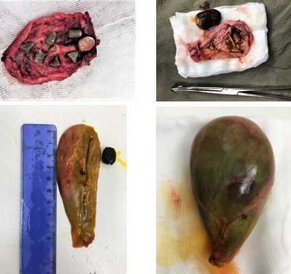 На фотографиях представлены удаленные жёлчные пузыри с извлеченными конкрементами. Внешний вид конкрементов разнообразный. Они отличаются по форме, размерами, внешнему виду и структуре.