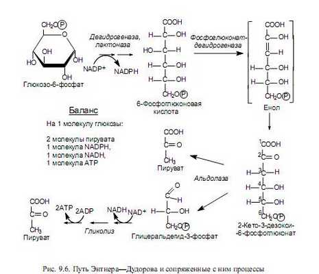 Последовательность подобных превращений глюкозы у бактерий идентична таковой у высших организмов. Этот путь катаболизма глюкозы следует рассматривать как второстепенный, но имеющий специальное назначение — источник пентоз для синтеза нуклеиновых кислот, а также источник восстановительных эквивалентов НАДФН+.