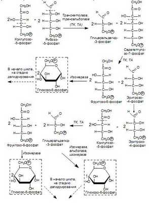 Следующий этап пентозофосфатных путей представляет собой многократные межмолекулярные перестройки и изомеризацию промежуточных соединений, формирующихся из рибулозо-5-фосфата. Эти реакции направлены на образование 6-углеродного соединения (глюкозо-6-фосфата), которое может снова подвергнуться окислению и декарбоксилированию. В результате из 6 молекул рибулозо-5-фосфата получается 5 молекул глюкозо-6-фосфата (рис.9.5).