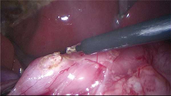 В подпеченочное пространство устанавливалась дренажная трубка Fr8. Ткань кисты и желчного пузыря удалялась через расширенный околопупочный разрез в области стояния оптического лапаропорта. Из брюшной полости удалялся углекислый газ и производилась герметизация лапароцентезных отверстий.