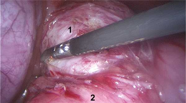 Диссекция кисты холедоха начиналась с дистальной части путем отделения ее от окружающих тканей, представленных двенадцатиперстной кишкой и поджелудочной железой (см. рис. 2). Рис. 2. Этап выделения кисты холедоха из окружающих тканей. 1 — киста холедоха, 2 — двенадцатиперстная кишка.
