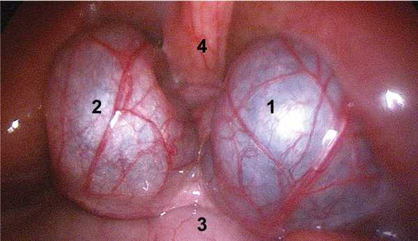 Пациент размещался на операционном столе в положении анти-Тренделенбург с приподнятым на 30° головным концом. Хирург располагался слева от пациента, ассистент — у ножного конца операционного стола. Видеомонитор размещался с правой стороны больного. Применялся карбоперитонеум с заданными параметрами: скорость потока — 3 л/мин, давление — 8 мм рт.ст. Оптический троакар диаметром 5 мм устанавливался в области пупочного кольца. Инструментальные лапаропорты диаметром 3 мм для правой (диссекционный зажим Келли, ножницы, иглодержатель) и левой (атравматичный зажим типа «утконос», аспирационная трубка) рук хирурга устанавливались соответственно в левом эпигастрии ниже реберной дуги на 2 см и правом гипогастрии. Дополнительный лапаропорт располагался в правом подреберье и предназначался для ретракции и фиксации ткани кисты холедоха и желчного пузыря в ходе диссекции. Печень подтягивалась кпереди с помощью трансдермального шва, который проводился вокруг круглой связки печени (см. рис. 1,). Рис. 1. Вид кисты общего желчного протока в начале операции. 1 — киста холедоха, 2 — желчный пузырь, 3 — двенадцатиперстная кишка, 4 — круглая связка печени.