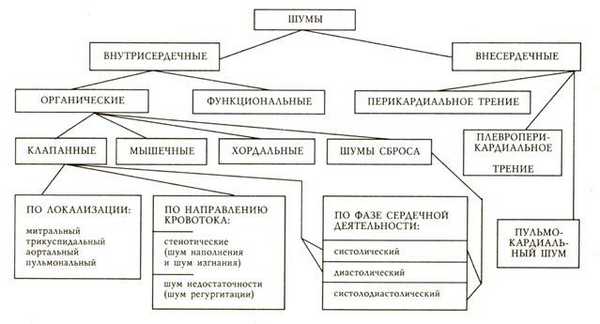 К сердечным шумам относят все звуковые явления, возникающие в области сердца, связанные с сердечной деятельностью, но отличающиеся от сердечных тонов. По месту и природе их возникновения выделяют эндокардиальные (функциональные и органические) и экстракардиальные (перикардиальные, плевроперикардиальные, кардиопульмональные) шумы (рис. 43).