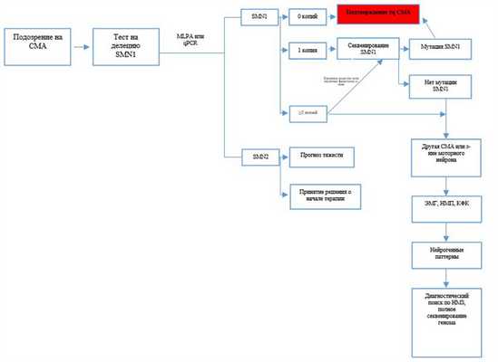 - Генетические тесты - предназначены для установления диагноза СМА, прогнозирования и выбора терапевтических подходов. Отсутствие полных копий SMN1 подтверждает диагноз, информация о копиях SMN2 является важной для прогноза и выбора терапии.