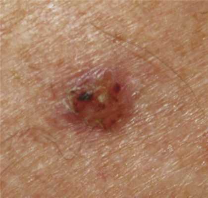 Во время осмотра пациента на коже в области задней поверхности левого плечевого сустава выявлено новообразование диаметром 1 см, слегка возвышающееся над поверхностью кожи, с наличием валика по периферии и покрытое коркой (рис. 1). Рис. 1. Опухоль на коже в области левого плечевого сустава. Со слов больного, новообразование на плече существует в течение длительного времени (более 2 лет), субъективно не беспокоит, однако в последнее время увеличилось в размерах и изредка сопровождается незначительными болезненными ощущениями. На основании клинической картины установлен диагноз «базалиома» и проведено хирургические иссечение опухоли в пределах здоровых тканей.