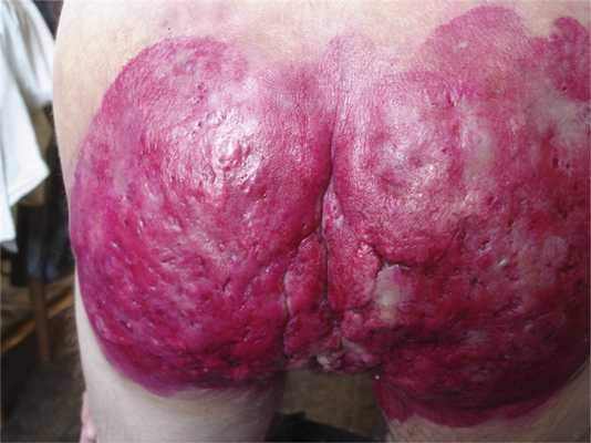 Дальнейшая эволюция элементов состоит в их росте по периферии, и одновременно с этим в центре уплощаются вегетации: вместо них появляется влажно-красная гранулирующая и постепенно рубцующаяся поверхность (рубцы мягкие и тонкие) [6]. В таком виде очаг может существовать месяцами и годами. В результате развиваются огромные бляшки (с ладонь и более), рубцующиеся в центре и непрерывно растущие по периферии.