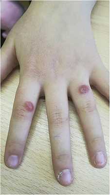 Рис. 2. Пациентка Д., 8 лет, очаг кожного лейшманиоза на тыле кисти II, IV пальцев.