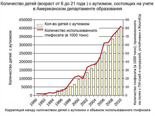 Целый ряд эпидемиологических исследований выявил тесную корреляцию между возросшим применением глифосата при производстве устойчивых к RoundUp генно-модифицированных растений и повышением частоты выявления таких нарушений со стороны нервной системы, как развитие аутизма и старческого слабоумия (Таблица 1) (22). Авторы связывают это со способностью глифосата вызывать состояние окислительного стресса не только в периферических органах, но и мозгу.