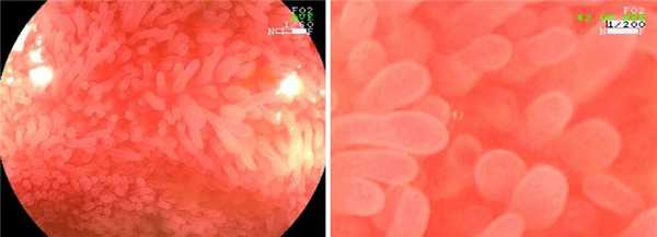 В методике увеличительной эндоскопии (или Zoom-эндоскопии) используются подвижные линзы для варьирования степени увеличения вплоть до 150-кратного (рис. 4). Рисунок 4. Эндоскопия слизистой оболочки подвздошной кишки при большом увеличении у пациента с болезнью Крона в стадии ремиссии. Хорошо видны ворсинки. При окрашивании всей ободочной кишки метиленовым синим хромоэндоскопии в комбинации с увеличительной эндоскопией расширяет возможности выполнения прицельной биопсии у больных с длительно текущим НЯК, а также ранней диагностики ИЭН и КРР [2]. При хромоэндоскопии достигается гораздо более достоверная, чем при обычной колоноскопии, корреляция между результатами оценки тяжести (р=0,0002) и объема (р<0,0001) воспаления СО толстой кишки, с одной стороны, и сопутствующими гистологическими изменениями, с другой стороны. Кроме того, хромоэндоскопия позволяет целенаправленно получать больше биопсийного материала и значительно точнее выявлять ИЭН (р=0,003).