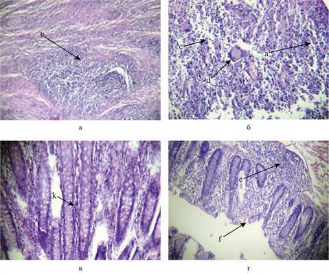 Заключение послеоперационного гистологического исследования удаленного макропрепарата илеоцекального перехода (рис. 4): Рис. 4. Больная Ч., 34 года. Микропрепараты илеоцекального перехода. а — лимфоидно-клеточная инфильтрация; b — лимфоидная гиперплазия; с — склерозирование стенки; d — клетки Пирогова—Лангханса; е — крипт-абсцесс; f — язва; k — бокаловидные клетки. Окраска гематоксилином и эозином; ув. 40 (а, б), ув. 100 (в, г). склерозирование всех слоев стенки с выраженной лимфоцитарной инфильтрацией и очаговой лимфоидной гиперплазией. Определяются гигантские клетки Пирогова—Лангханса, крипт-абсцессы, глубокая язва. Количество бокаловидных клеток сохранено. Данная картина соответствует болезни Крона.