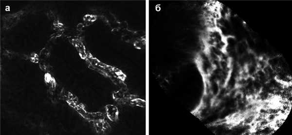 Методика конфокальной лазерной эндомикроскопии применяется с 2004 г. Она позволяет увидеть СО кишечника in vivo в реальном времени при 1000-кратном увеличении во время эндоскопии [13]. В настоящее время имеются два устройства, разрешенных к применению Администрацией США по контролю за лекарственными препаратами и пищевыми продуктами - FDA (рис. 5). Рисунок 5. Конфокальная лазерная эндомикроскопия с использованием встроенного (iCLE, а) либо автономного (рCLE, б) зондов. Выявляются расширенные микрососуды, повышенная сосудистая проницаемость и нарушенная структура крипт при активном язвенном колите. Одно устройство встраивается в дистальный наконечник эндоскопа высокого разрешения (iCLE, Pentax, Токио, Япония), а другое представляет собой автономный зонд, свободно проходящий через рабочий канал большинства стандартных эндоскопов (pCLE, Cellvizio, Mauna Technologies, Париж, Франция). Лазерный источник синего света генерирует возбуждающее излучение с длиной волны 488 нм, а отраженный свет определяется на волне >505 нм. При эндомикроскопии требуется применение системных (флуоресцеин) либо топических (акрифлавин, крезиловый фиолетовый) флуоресцентных красителей [14].