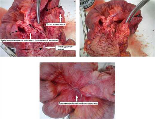 Макропрепарат илеоцекальной области представлял собой конгломерат (рис. 3), Рис. 3. Больная Ч., 34 года. Макропрепараты илеоцекального перехода после правосторонней гемиколэктомии. Фото. b — язва; k — просвет восходящей ободочной кишки; i — просвет слепой кишки; m — просвет подвздошной кишки. состоящий из спаянных между собой петель восходящей ободочной, слепой и подвздошной кишок. При рассечении этого участка определялась значительная плотность ткани, деформация стенки, элементы баугиниевой заслонки не дифференцировались, в районе предполагаемой нижней губы баугиниевой заслонки — глубокая язва, неправильной формы, с плотными краями.