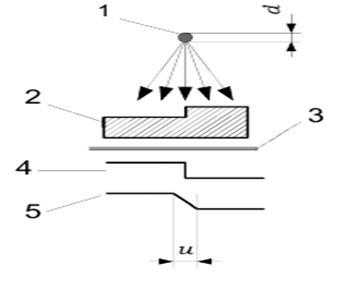 1 - источник излучения; 2 - объект контроля с резким изменением толщины; 3 - радиографическая пленка; 4 - профиль радиационного изображения; 5 - сглаженный профиль оптической плотности снимка объекта контроля