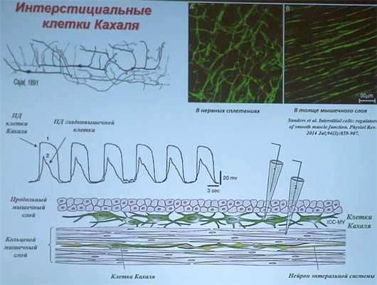 Являясь водителями ритма, они играют ключевую роль в активации и координации фазных и распространяющихся сокращений. Другой функцией этих клеток служит контроль за передачей возбуждающих и тормозных нервных импульсов гладкомышечным клеткам (Andrews Ch.N., Storr M.).