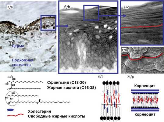 Поверхностный слой эпидермиса состоит уже из частиц, которые постепенно отшелушиваются (см. рисунок, г). Для удержания чешуек вместе и сохранения целостности барьера кожа вырабатывает липидный клей, состоящий преимущественно из церамидов.
