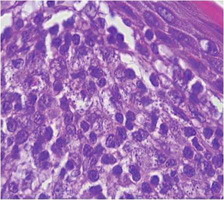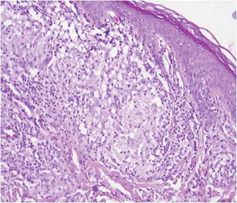 Во время биопсии взят материал для цитологического исследовании с окраской по Романовскому—Гимзе для обнаружения амастигот лейшмании: результат отрицательный. Диагностическая биопсия кожи левого предплечья: в дерме гистиоцитарная инфильтрация из эпителиоидных клеток со слабоэозинофильной цитоплазмой с формированием некротизирующихся гранулем, окруженных лимфоцитами, плазматическими клетками и единичными нейтрофилами. В цитоплазме субэпидермально расположенных гистиоцитов определяются немногочисленные мелкие базофильные структуры с округ-лыми очертаниями. Заключение: гистологические изменения более всего соответствуют лейшманиозу кожи. Менее вероятна болезнь Розаи — Дорфмана. Для уточнения диагноза рекомендуется обследование пациента в специализированном учреждении (рис. 4, 5).