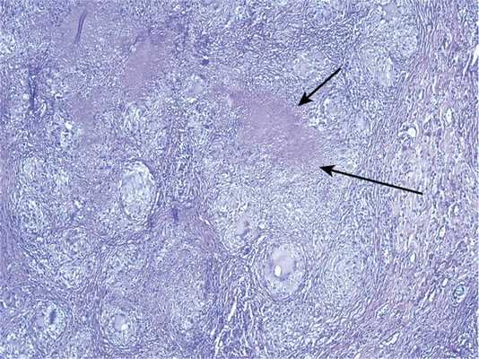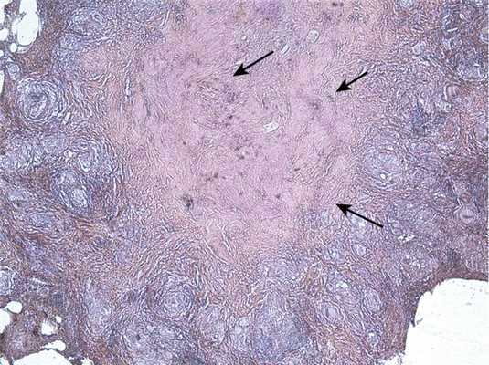 Рис. 5. Гистологический препарат. НСГ легкого с реакцией в плевре: конгломерат из макрофагально-гистиоцитарных гранулем с очагом фибриноидного некроза (обозначены стрелками). Окраска гематоксилином и эозином, ×250.