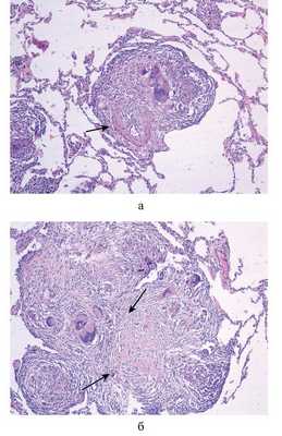 Рис. 2. Гистологические препараты. НСГ. Гранулематозный васкулит легочной артериолы. а - одиночная гранулема в среднем слое гиалинизированной стенки сосуда, ×120 (сосуд обозначен стрелкой); б - гиалиноз в конгломерате гранулем области спавшихся сосудов, ×240 (обозначен стрелками). Окраска гематоксилином и эозином.