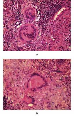 Рис. 3. Гистологические препараты. НСГ. Клеточный состав гранулем. а - преобладание лимфоцитов и гистиоцитов, ×480; б - многоядерный гигантский макрофаг, ×600. Окраска гематоксилином и эозином.