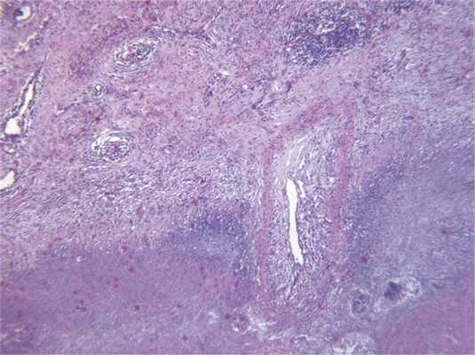 Некротические гранулемы могут формироваться в легком и при ревматоидном артрите, однако диагноз в этом случае следует формулировать с осторожностью. Прежде всего следует учитывать клинические данные, поскольку узелковые формы ревматоидного артрита развиваются только в активной фазе заболевания, у серопозитивных пациентов с наличием выраженного суставного синдрома. При этом заболевании некроз, как правило, окрашен эозинофильно, клеточный детрит располагается обычно между некрозом и окружающим его гистиоцитарным валом, может сочетаться с васкулитом, однако некротический васкулит нехарактерен (рис. 7) Рис. 7. Ревматоидный артрит: обширная зона некроза с гистиоцитарным валом по периферии, лимфоидная инфильтрация стенок сосудов с обтурацией просветов, ×40. [12]. Описанные гистологические изменения практически неотличимы от таковых инфекционного гранулематоза, кроме того, описаны редкие наблюдения сочетания ревматоидного артрита и туберкулеза, поэтому необходимо исключить наличие инфекции.