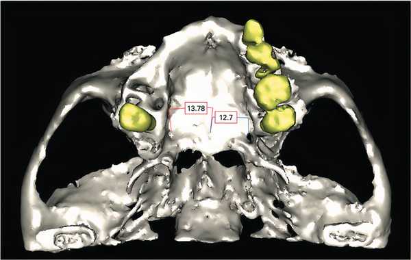 Обычно у черепа присутствует двусторонняя симметрия. Во многих исследованиях сообщалось о среднем расстоянии от большого небного отверстия до срединно-сагиттального шва или до дистальной границы твердого неба, однако данные значения могут быть неточными для конкретного пациента из-за вариативности расположения большого небного отверстия. Таким образом, изучение трехмерной компьютерной томографии (3Д КТ) пациента отобразит точное расположение большого небного отверстия перед хирургической манипуляцией для проведения анестезии или создания лоскута в данной области (рис. 2).