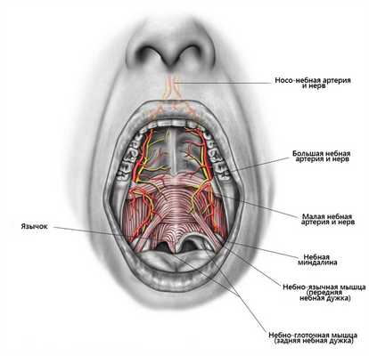 Кровоснабжение слизистой оболочки полости рта обеспечивают наружная сонная артерия и ее ветви - верхняя челюстная артерия, нижняя луночковая артерия и др. Щечная артерия, задняя верхняя альвеолярная и подглазничная артерии кровоснабжают слизистую оболочку преддверия рта и десны верхней челюсти. Слизистую оболочку неба питают ветви нисходящей небной артерии. Вены, сопровождающие артерии, впадают во внутреннюю яремную вену. Лимфа оттекает в регионарные подбородочные и подчелюстные лимфатические узлы. Иннервация слизистой оболочки полости рта обеспечивается за счет второй и третьей ветвей тройничного, носонебного, щечного, язычного, языкоглоточного и блуждающего нервов [1, 2, 5, 6].