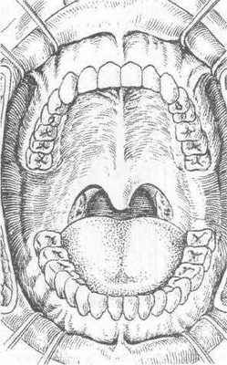 Полость рта (саvitas oris) является начальным отделом пищеварительного тракта. Она ограничена спереди и с боков губами и щеками, сверху — твердым и мягким небом, снизу — дном полости рта. При сомкнутых губах ротовое отверстие имеет форму щели, при открытых — округлую форму. Полость рта (рис. 3.1) состоит из двух отделов: переднего, или преддверия рта (vestibulum oris), и заднего отдела — собственно полости рта (cavitas oris propria). Преддверие рта ограничено спереди и по бокам губами и щеками, сзади и изнутри — зубами и слизистой оболочкой альвеолярных отростков верхней и нижней челюстей. Собственно полость рта посредством зева соединяется с полостью глотки.