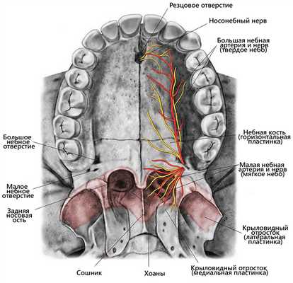 Верхнечелюстная артерия и нерв входят в крыловидно-верхнечелюстную щель, чтобы достигнуть крыловидно-небной ямки примерно на 16.6 мм выше дна носовой полости, разветвляясь (в ямке) на заднюю верхнюю альвеолярную артерию, подглазничную артерию и нисходящую небную артерию. После выхода из подглазничного отверстия от подглазничной артерии ответвляются верхние передние альвеолярные артерии. Нисходящая небная артерия проходит небольшое расстояние внутри крыловидно-небной ямки, а затем входит в большой небный канал. Она находится внутри канала на протяжении примерно 10 мм, направляясь вниз, кпереди и немного медиально, затем покидает его через большое небное отверстие сразу напротив или даже дистальнее третьего моляра верхней челюсти или в области между вторым и третьим молярами и идет кпереди. Внутри большого небного канала от нее отходят малые небные артерии для кровоснабжения мягкого неба и миндалин (рис. 1).