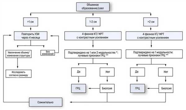 при узле 1-2 см диаметром диагноз базируется на неинвазивных методах визуализации или данных биопсии. Если последние оказались неубедительны или паттерн контрастного накопления при КТ/МРТ изменился за время исследования, рекомендована вторая биопсия;