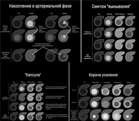 Если образование накопило контраст в артериальную фазу, а в более поздние фазы выглядит изоинтенсивно паренхиме печени, это называют симтомом «выцветания» (fade). Термин «капсула» при визуализации соотносится с наличием как капсулы, так и псевдокапсулы у опухоли. «Капсула» визуализируется как ровный гладкий ободок по периферии образования, который усиливается в портовенозной или отсроченной фазе и является более толстым или более заметным, чем у ободки фоновых цирротических узелков.
