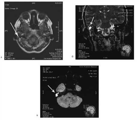 Пациентке была выполнена МРТ основания черепа по описанной методике (рис. 1). Рисунок 1. МРТ основания черепа больной Ф. с хроническим правосторонним гнойным средним отитом. Фистула лабиринта. Холестеатома. а — исследование в режиме Т1; б — в режиме Т2; в — в режиме non-EPI DWI.