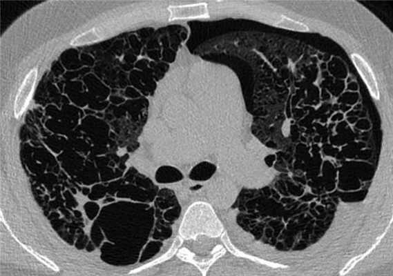 Пациент П., 36 лет с анамнезом курения 20 пачка/лет, в настоящее время отказался от курения в связи с тяжестью состояния. Предъявлял жалобы на одышку в покое, усиливающуюся при минимальной физической нагрузке, кашель с отделением светлой мокроты и редкие эпизоды кровохарканья. Впервые за медицинской помощью обратился в 2010 г., был диагностирован рецидивирующий правосторонний пневмоторакс (3 эпизода), выполнен плевродез. В дальнейшем пациент стал отмечать одышку, не купирующуюся бронходилататорами. В 2013 г. в течение 6 мес принимал кортикостероиды. В июне и июле 2013 г. перенес 3 эпизода левостороннего пневмоторакса. При КТВР в июле 2013 г. выявлены множественные воздушные полости во всех отделах легких (рис. 10) Рисунок 10. КТВР. Множественные тонкостенные полости, сливающиеся между собой, субплевральные участки интерстициального фиброза. , сливающиеся между собой, а также участки «сотового легкого», внутригрудные лимфатические узлы увеличены до 1,8 см. При рентгенологическом исследовании костей скелета литические очаги не выявлены. На ЭКГ выявлено резкое отклонение электрической оси сердца вправо и блокада задней ветви левой ножки пучка Гиса, что отражает перегрузку правых отделов сердца. При ЭхоКГ выявлена трикуспидальная регургитация 2-й степени с градиентом давления 50 мм рт.ст. и дилатация правых отделов сердца как подтверждение вторичной легочной артериальной гипертензии. При исследовании функции внешнего дыхания ЖЕЛ =2,39 л (46,1%), ОФВ 1 =1,30 л (30,4%), ОФВ 1 /ЖЕЛ =54,51%, DLCO =10,40 (29,6%), что отражает выраженное нарушение вентиляции легких по обструктивному типу. В связи с тяжестью состояния в сентябре пациент был включен в лист ожидания трансплантации легких в НИИ СП им. Н.В. Склифосовского, в октябре выполнена успешная двусторонняя пересадка легких. В настоящее время состояние пациента удовлетворительное.