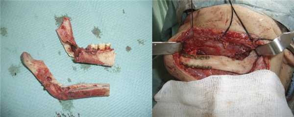 Кровотечения после эмболизации не было. Через 5 дней после эндоваскулярного вмешательства проведена операция резекции нижней челюсти слева с экзартикуляцией. При обнажении нижнего края челюсти выявлено множество нефункционирующих, запустевших сосудов артериального и венозного типов. Поверхность наружной кортикальной пластинки тела и ветви челюсти узурирована и не кровоточит. При скелетировании внутренней поверхности ветви нижней челюсти визуализирован обширный очаг деструкции кортикальной пластинки. В крылочелюстном и окологлоточном пространстве обнаружены гипертрофированные запустевшие сосуды, преимущественно венозного типа, в просвете которых находился Onyx 18 в виде рыхлой губки серо-черного цвета. За пределами операционной раны резецирован альвеолярный отросток вместе с зубами и была удалена губчатая кость и элементы сосудисто-нервного пучка. Из макропрепарата смоделирован ортотопический аутотрансплантат, проведена его реплантация с фиксацией титановыми пластинами к основному фрагменту нижней челюсти. Кровопотеря во время операции не превысила 200 мл (рис. 4). Рис. 4. Формирование реплантата из резецированного фрагмента тела и ветви нижней челюсти и его фиксация титановыми пластинами.