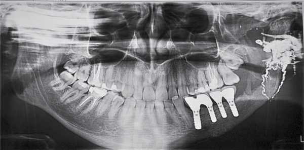 Через 6 мес после проведения реконструктивно-восстановительных операций по восстановлению высоты и объема нижней челюсти пациенту установили дентальные имплантаты с последующим изготовлением несъемной металлокерамической конструкции. Продолжительность реабилитации пациента после операции по удалению АВМ составила 20 мес (рис. 8). Рис. 8. Ортопантомограмма пациента Н. после установки дентальных имплантатов и изготовления несъемных металлокерамических конструкций. Полная реабилитация.