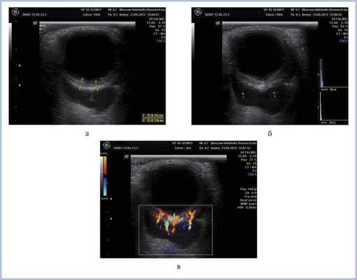 Рис. 5. Результаты дуплексного сканирования. а — утолщение хориоидеи; б — денситометрические показатели акустической плотности опухоли в В-режиме; в — множественные собственные сосуды опухоли, единая васкуляризация внутриглазного и орбитального очагов в режиме ЦДК.