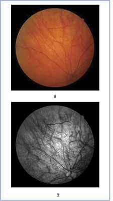 Рис. 3. Офтальмоскопическая картина (а) и флюоресцентная ангиограмма (б) глазного дна правого глаза.