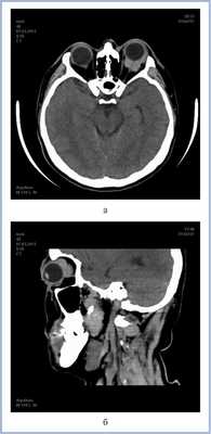 Рис. 4. Компьютерная томограмма орбит в аксиальной (а) и сагиттальной (б) проекциях.